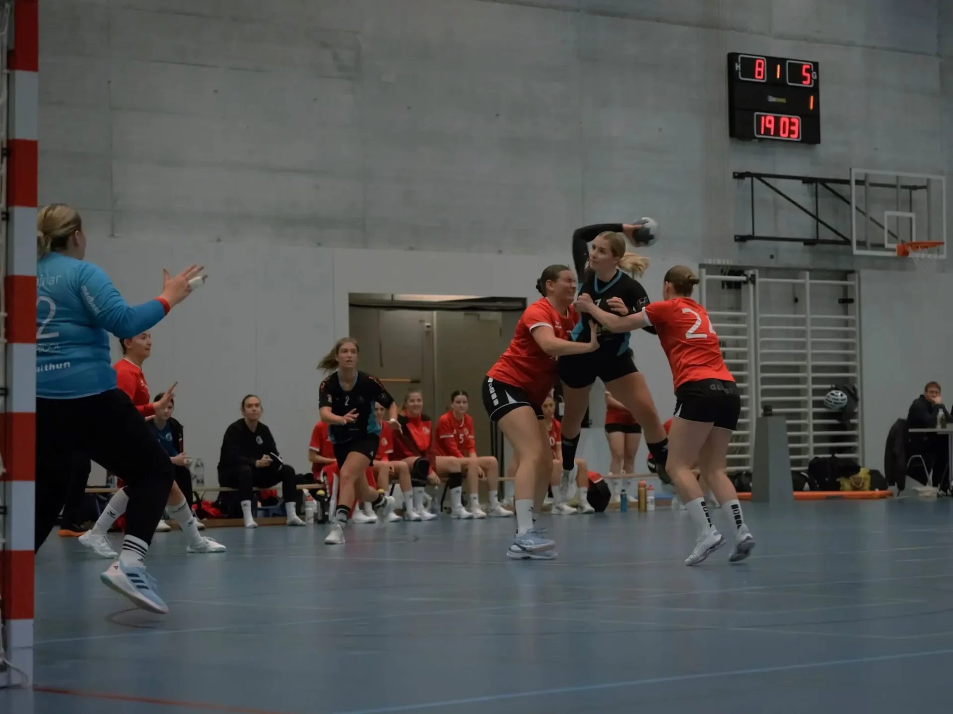 Wir starteten gut ins Spiel. Unsere 4:2-Verteidigung bereitete Thun Schwierigkeiten und zwang sie zu Fehlwürfen. Im Angriff mussten wir trotz schöner Aktionen zuerst ein wenig ins Spiel finden und uns ans Flügelpressen gewöhnen. Die starke Verteidigung überwog aber, und so nahm Thun nach 10 Minuten ihr erstes Team-Time-out bei einem Spielstand von 7:4. Solide ging es weiter, sodass zur Pause 15:11 stand.